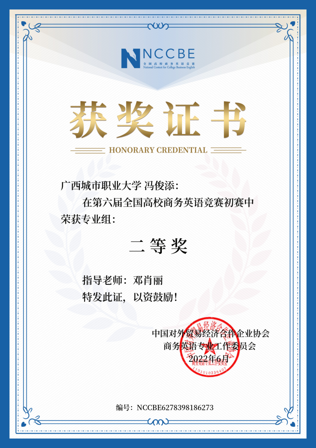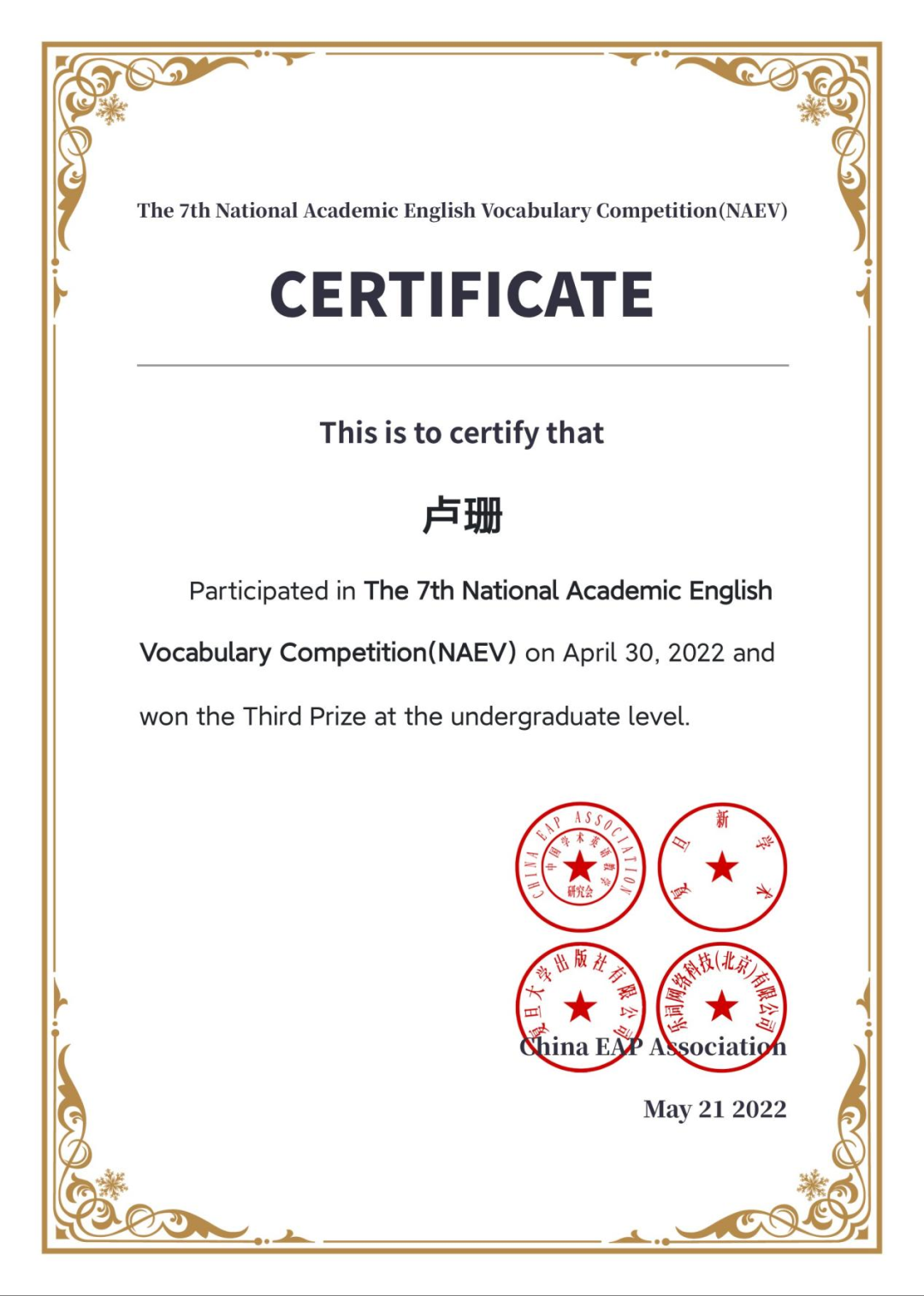 在2022年各类国家级学科竞赛中,荣获一等奖2项,二等奖2项,三等奖4项,同时荣获2022年第七届全国大学生学术英语词汇竞赛“优秀组织奖”;在2022年各类区级学科竞赛中,荣获一等奖1项,二等级1项,三等级2项。