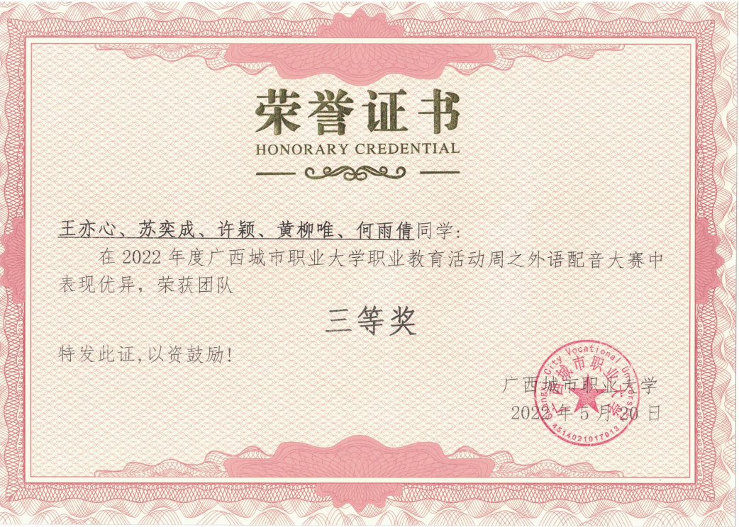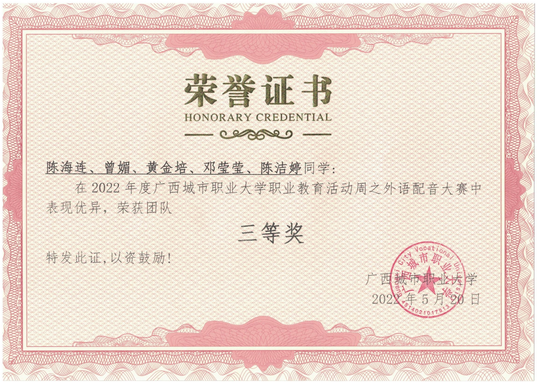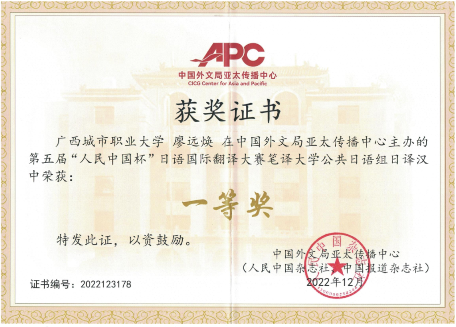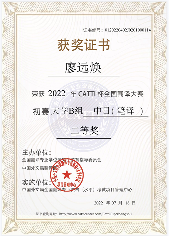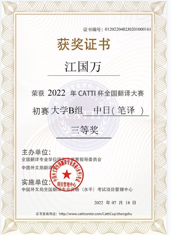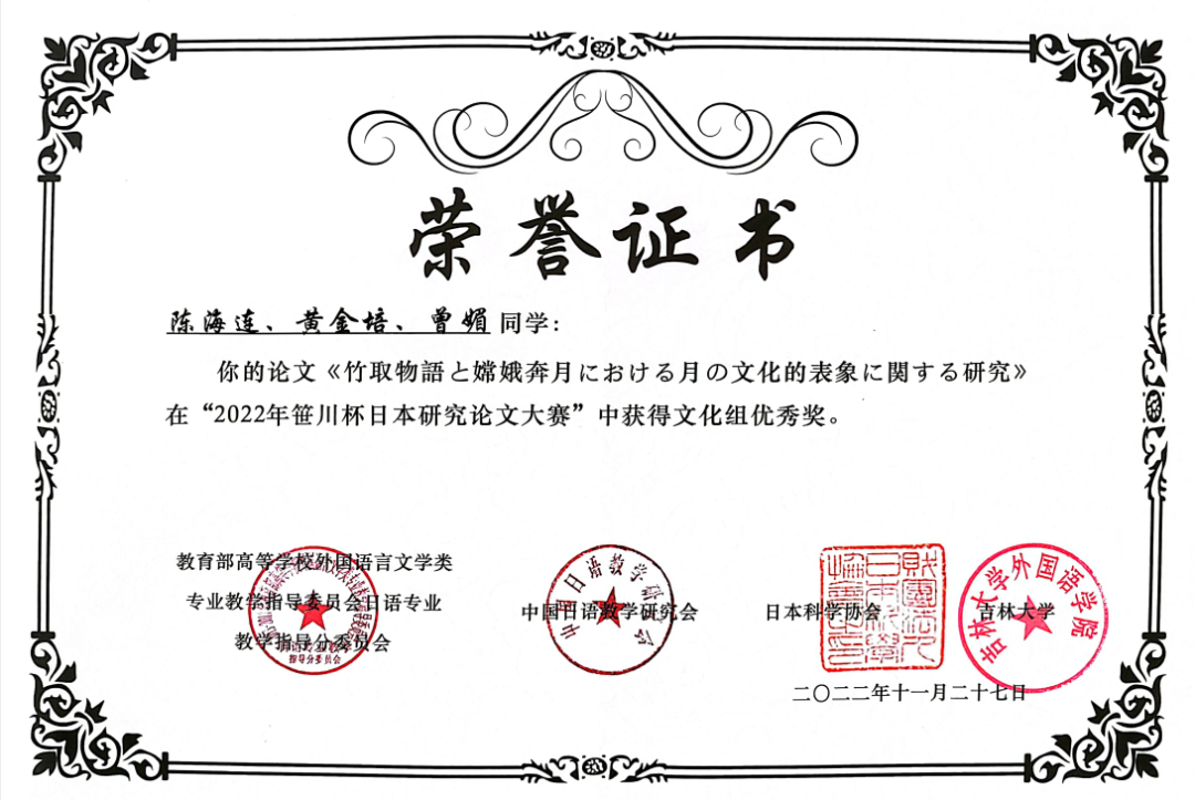应用日语专业学子曾荣获2022年CATTI杯全国翻译大赛二等奖1项、三等奖2项;第五届“人民中国杯”日语国际翻译大赛笔译日译汉一等奖1项;2022年“笹川杯”日本研究论文大赛优秀论文奖1项等奖项。以及在校级职业教育活动周的外语配音大赛及外语话剧大赛中,应用日语专业学子荣获一等奖2项、二等奖1项、三等奖4项等。