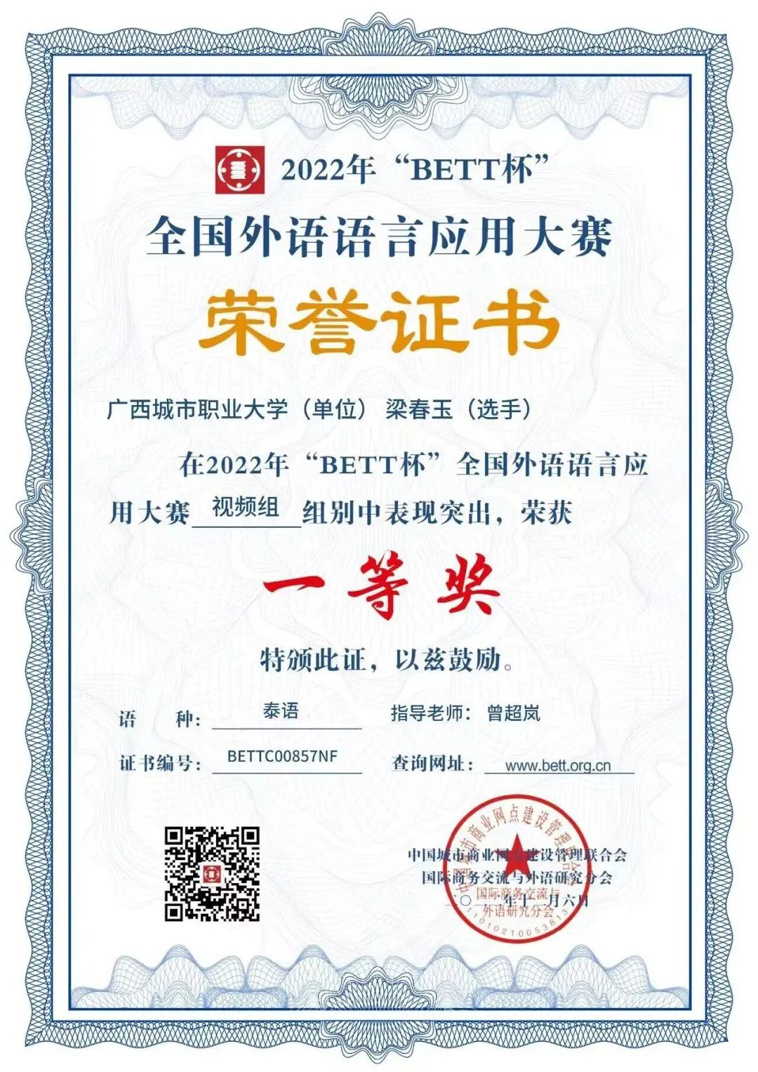 应用泰语专业学生在泰国留学期间获得泰国学校优秀学生奖学金;荣获泰国清莱皇家大学2019年模特大赛一等奖。在国内学习期间,本专业学生以各级各类职业技能大赛为平台,培养学生动手实操能力和科技创新能力。学生在各级各类大赛中荣获12个奖项,其中获广西区级优秀奖2项,校级一等奖1项,校级二等奖5项,校级三等奖4项。此外,在2022年全国大学生创新创业训练计划项目中获得广西区级立项2项,参加BETT杯2022年全国外语语言应用大赛泰语视频组一等奖2项。