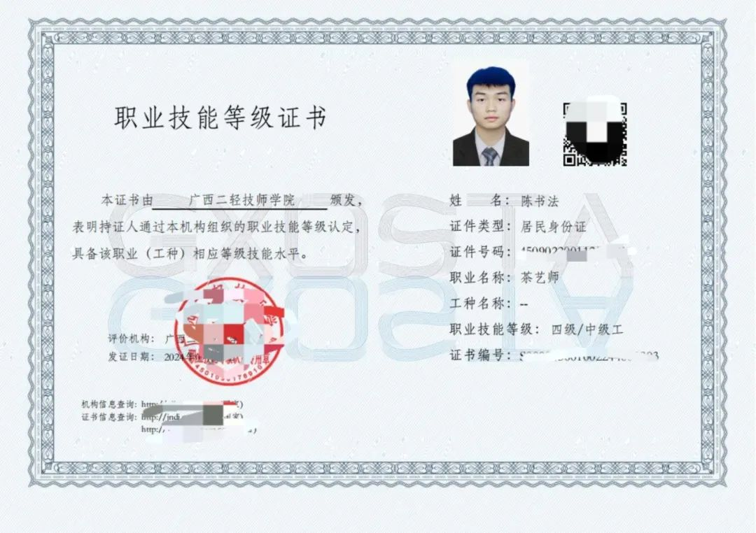 考取的证书:办公软件、中式面点师(中级)、茶艺师(中级)。