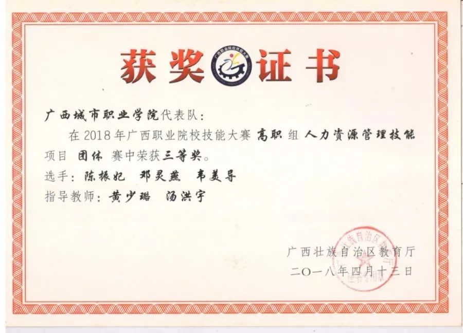 我校代表队荣获2018年广西职业院校技能大赛高职组人力资源管理技能三等奖