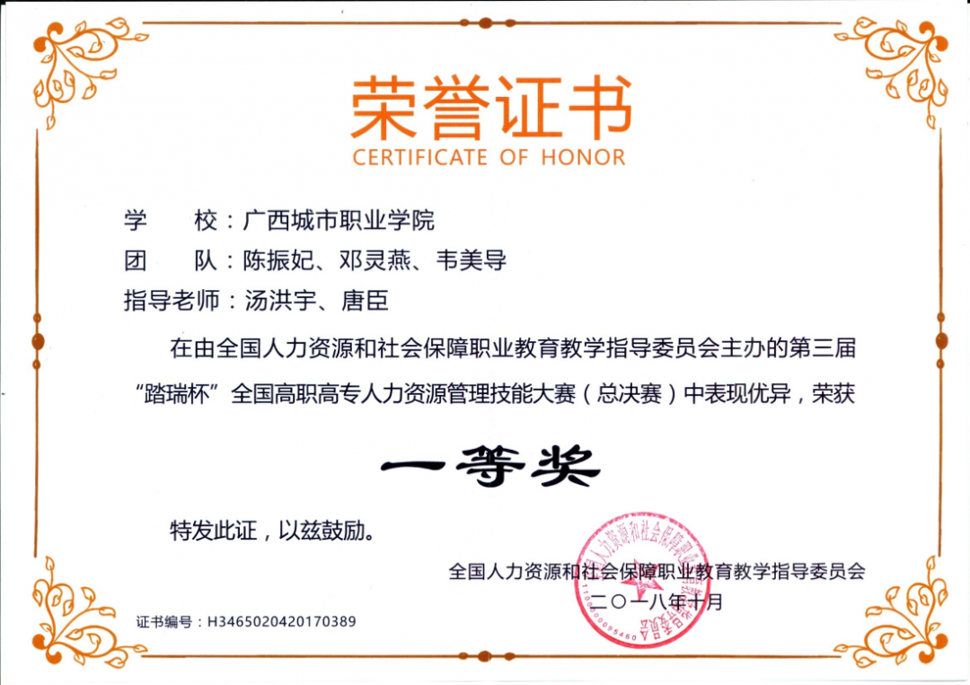 我校陈振妃等同学荣获第三届“踏瑞杯”全国高职高专人力资源管理技能大赛一等奖
