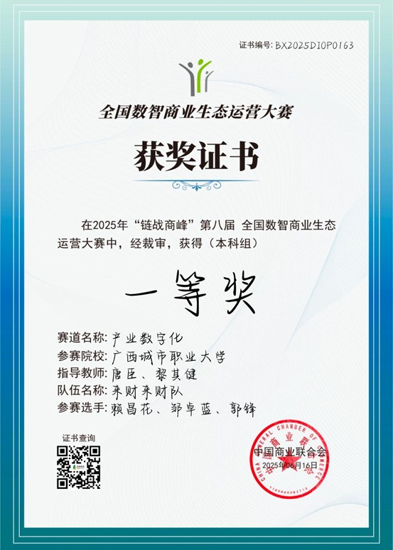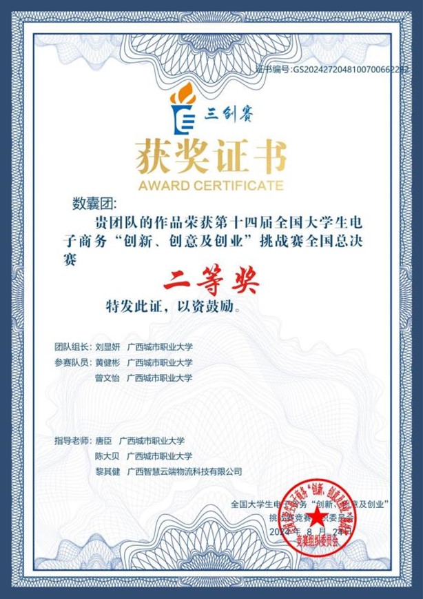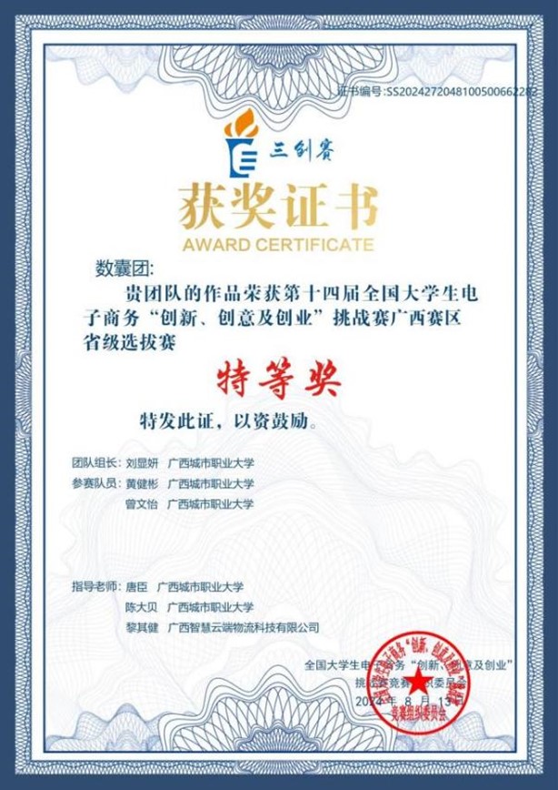 全国大学生电子商务“创新、创意及创业”挑战赛广西壮族自治区级选拔赛特等奖、全国总决赛二等奖