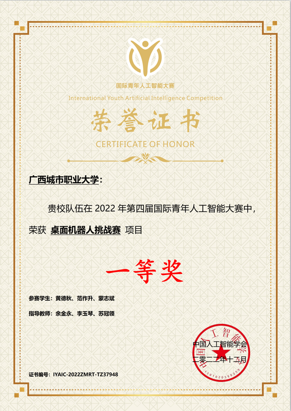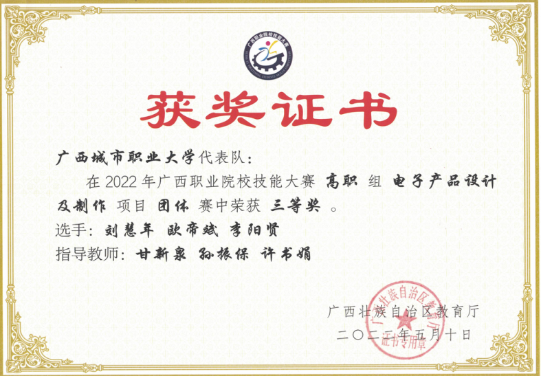 近年来,本专业教师指导学生参加第二十四届中国机器人及人工智能大赛、广西大学生电子设计大赛、广西职业院校技能大赛等各级竞赛屡获殊荣,其中国家级1项,自治区级2项,行业企业比赛1项。